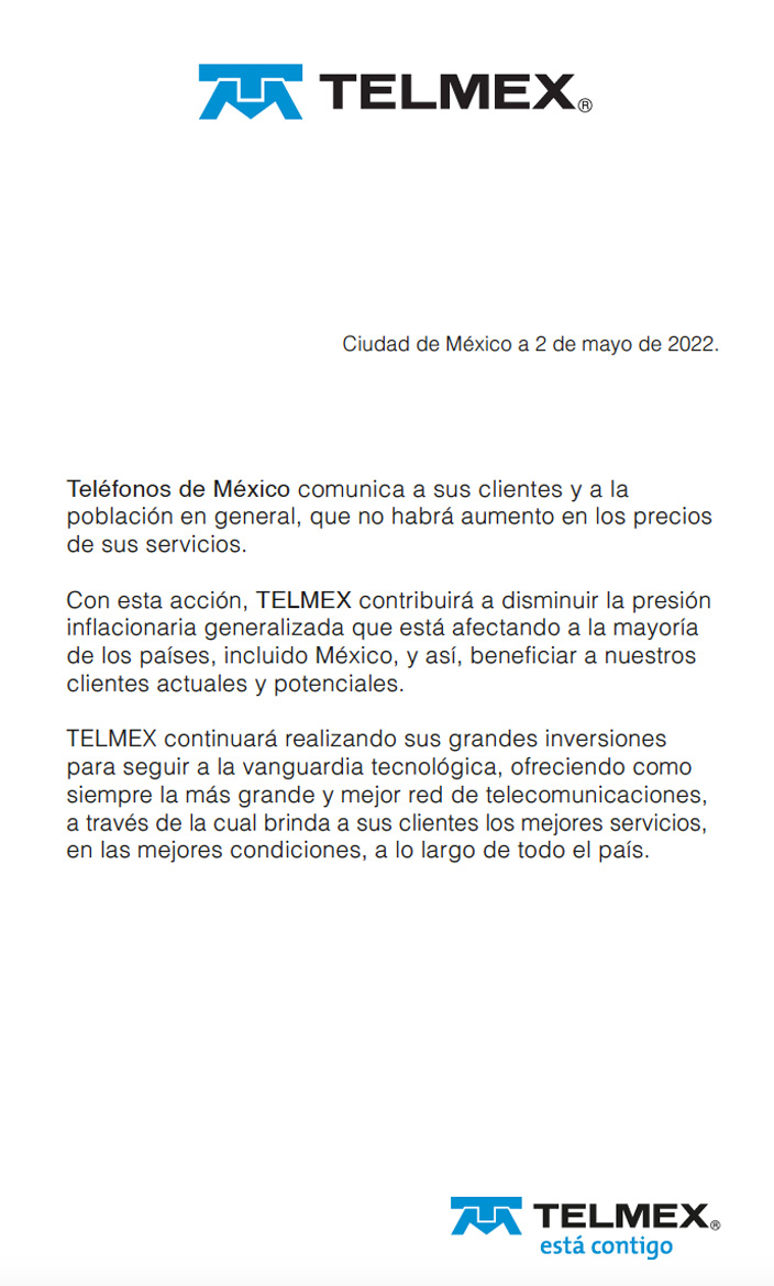 Teléfonos de México comunica a sus clientes y a la población en general, que no habrá aumento en los precios de los servicios