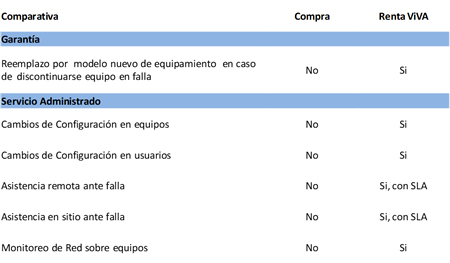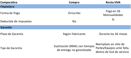 4. Las principales diferencias entre la compra de activos (equipamiento) y la renta de servicio VIVA; cómo dato de equipamiento son: