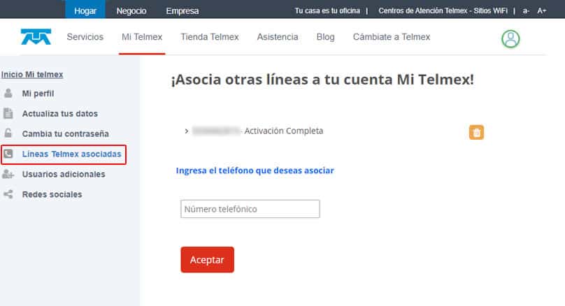 3. En el menú lateral izquierdo, selecciona la opción “Líneas Telmex asociadas” y captura el Número Telmex (10 dígitos), si ingresaste un teléfono correcto, aparecerá como “pendiente de activación”.